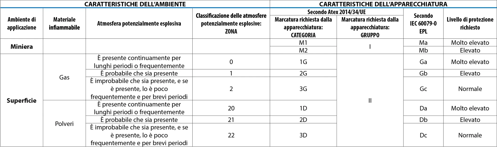 • I dispositivi sono assegnati a delle categorie le quali sono assegnate a determinate zone potenzialmente esplosive.