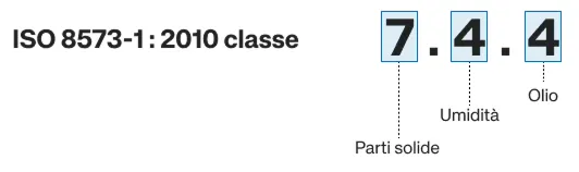 Tale norma definisce con 3 numeri in sequenza i valori in cui sono presenti le parti solide, l’umidità e l’olio nell’aria rispettivamente come evidenziato